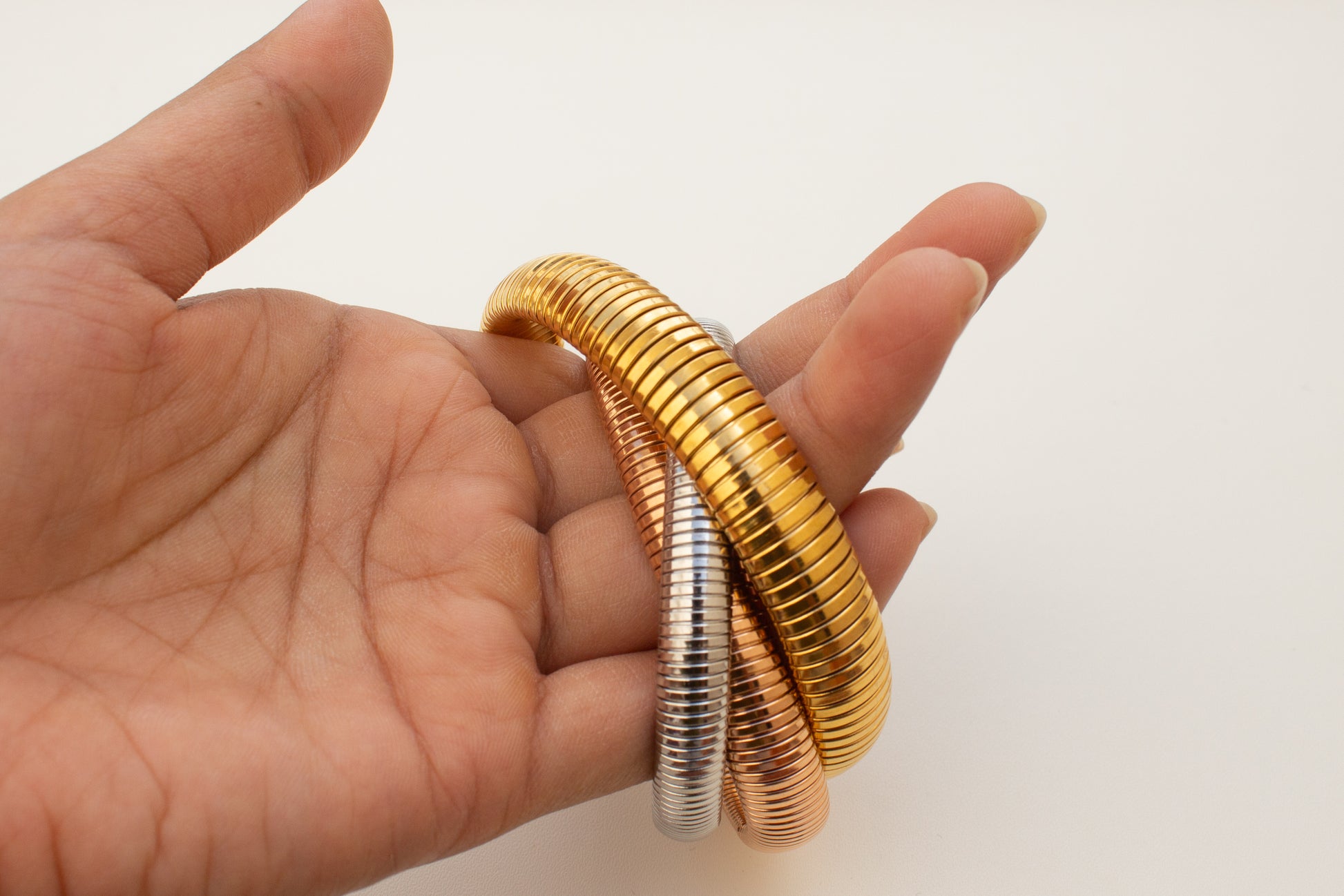 - Rose gold, gold and silver colour bangles over expandable base