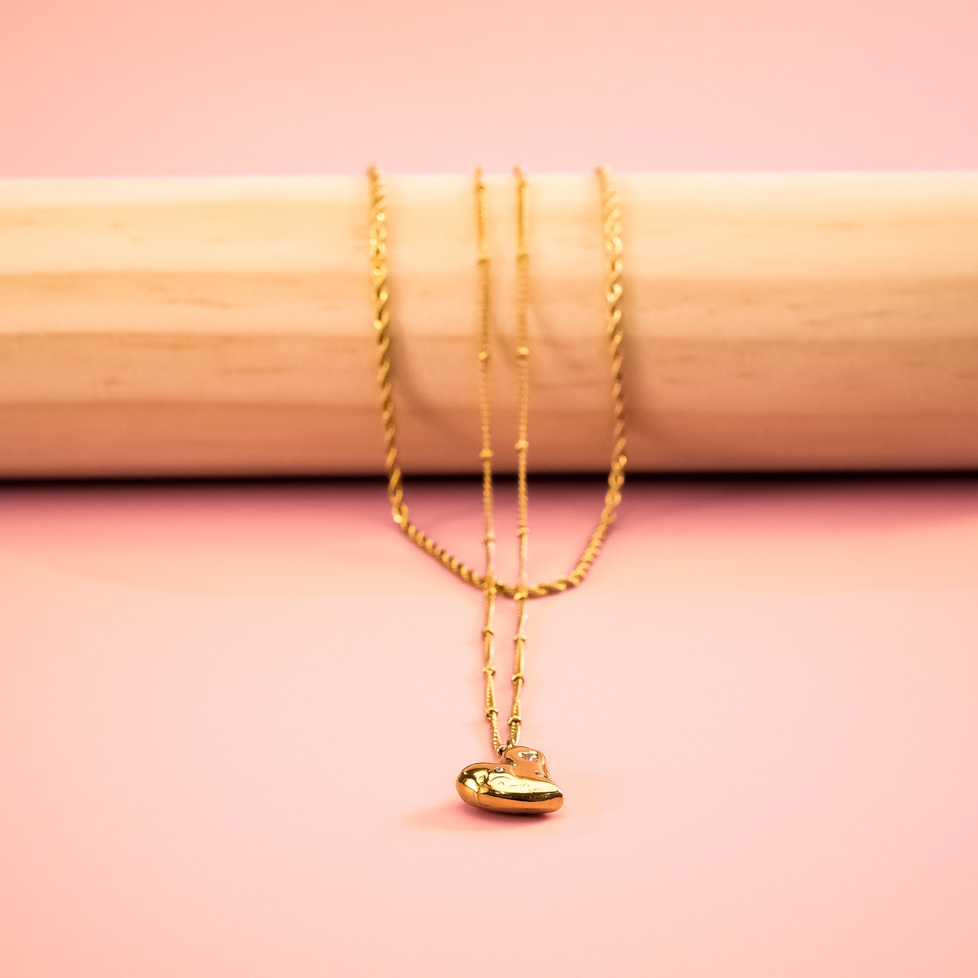 Heartline traces form with quiet precision, a pendant suspended at the meeting point of two gold lines. Unembellished. Intentional. Built like direction. Held like thought. It doesn’t rest on the skin. It defines its axis.
